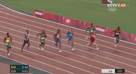 “闪电”博尔特9秒81,加特林9秒89,格拉西9秒91。