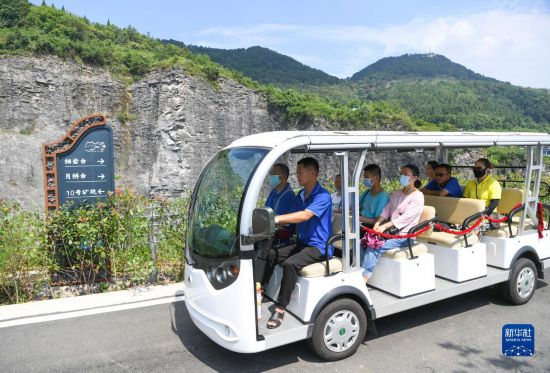8月20日,重庆铜锣山矿山公园观光车司机余良明(左二)驾车带着游客游览,他是石船镇石壁村村民。