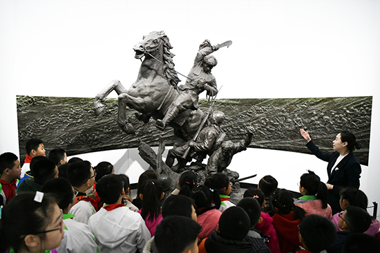 2019年4月4日,在东北烈士纪念馆,学生们在听讲解员讲解。