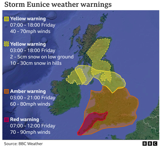 2月18日上午11点,英国气象局发布最高级别的风暴红色预警,覆盖德文郡、康沃尔郡和萨默塞特郡的海岸线以及南威尔士。短短几小时后(当地时间凌晨四点),英国气象局发布第二个红色预警,覆盖英格兰东南部的大部分地区,而这也是英国首都伦敦首次发布“红色预警”。