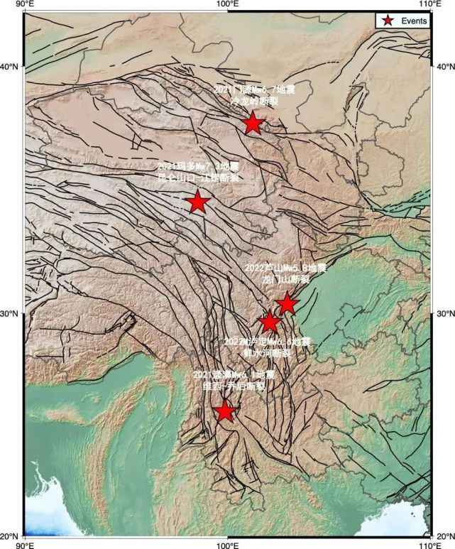 在龙门山断裂上曾经发生了2008年汶川大地震以及2013年芦山地震,而最近的泸定地震发生在鲜水河断裂的最南端(磨西段)。