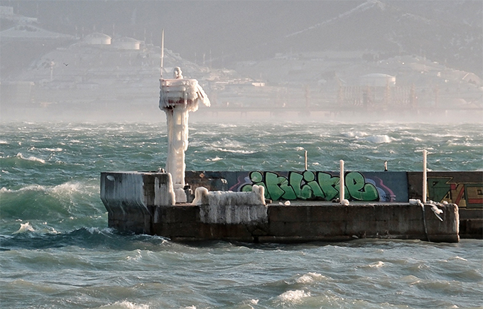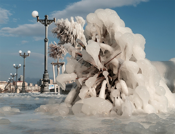 当地时间2023年2月9日,俄罗斯新罗西斯克,黑海暴风雨过后,广场上的建筑被厚冰覆盖。由于强风和恶劣天气,新罗西斯克中部已宣布进入紧急状态。