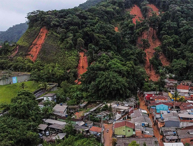 当地时间2023年2月20日,巴西圣保罗州圣塞巴斯蒂安,航拍暴雨后的山体滑坡。