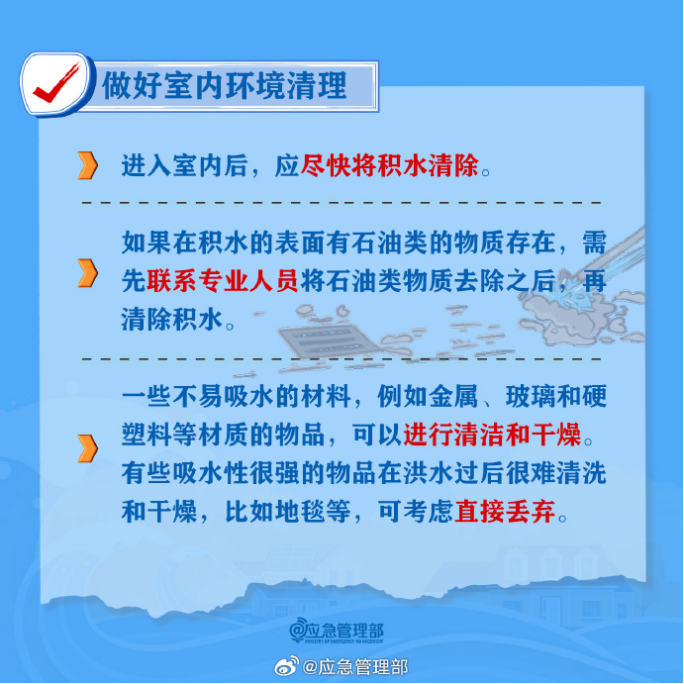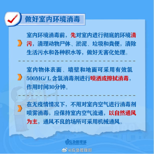 进入室内后,应尽快将积水清除。在室内环境消毒前,先对室内进行彻底的环境清污,清理动物尸体、淤泥、垃圾和粪便,清除生活污水和各种积水等,做好无害化处理。