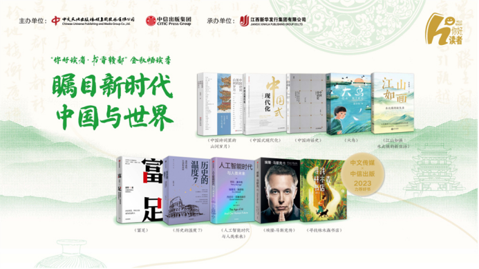活动中,十大优秀推荐图书发布,中文传媒携手中信出版集团共同揭晓联合书单,向广大读者精选推荐10种优秀图书。将《江山如画:水北镇的新生活》《埃隆·马斯克传》《大鸟》《人工智能时代与人类未来》《中国式现代化》《中国诗词里的山河岁月》《富足》《中国诗话史》《寻找林木森书店》等作为金秋畅读季重点推荐出版物。
