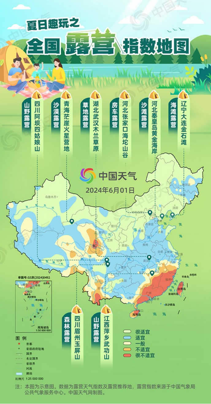 伴随夏季的到来,选择露营消暑的人越来越多,无论是探访森林秘境、畅游海边沙滩,还是驰骋沙漠天地,众多露营玩法丰富了人们的休闲生活。天气温暖风不燥,正是露营的好时节。中国天气网联合中国气象局公共气象服务中心发布全国露营指数地图,十大推荐地玩法多多,还有户外安全攻略,助你乐享自然野趣。