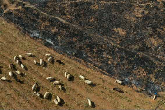 当地时间2024年10月2日,希腊科林斯野火过后,羊群在烧焦区域附近吃草。