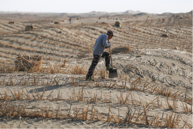 2024年12月3日,工人在新疆和田地区民丰县后河坝沙漠阻击区补扎草方格。新华社记者王菲 摄