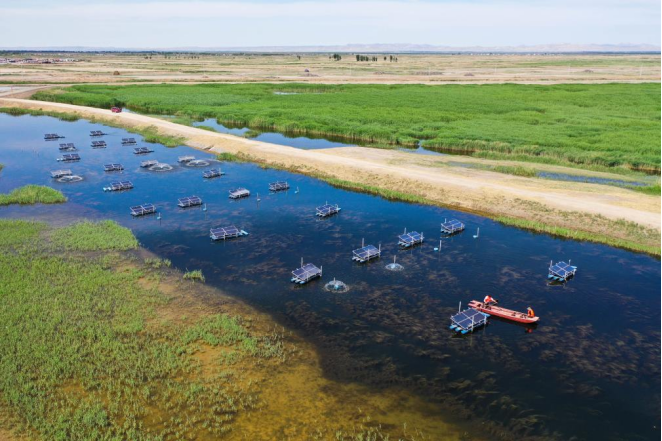 2025年6月4日,在内蒙古乌拉特前旗九排干人工湿地,太阳能曝气机对进入乌梁素海的水体曝气增氧(无人机照片)。新华社记者李志鹏 摄
