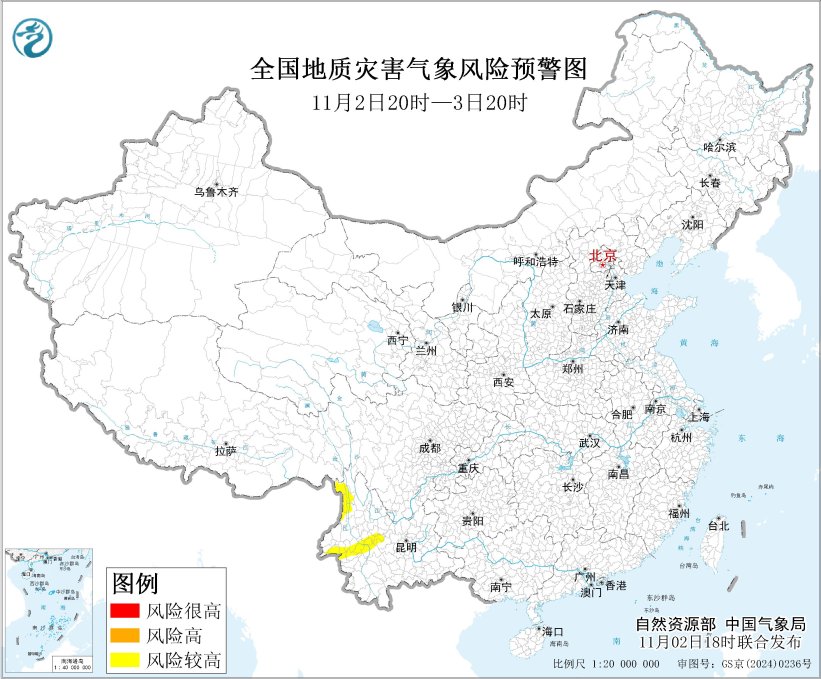 自然资源部与中国气象局11月2日18时联合发布地质灾害气象风险预警: