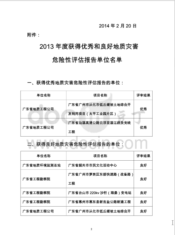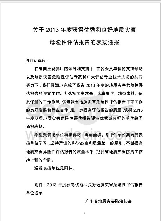 2014年2月20日,广东省地质灾害防治协会对2013年度获得地质灾害危险性评估报告评审优秀或良好的单位给予通报表扬。