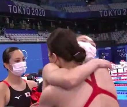 两个刚完赛的女孩子一见面,亲切地抱在一起。