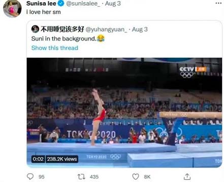 她就是本届奥运个人全能冠军、美国选手苏妮莎·李,管晨辰的“头号迷妹”。