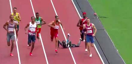 难民代表团的一名南非选手在男子800米小组赛中摔倒在地,