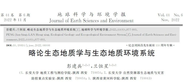主编彭建兵院士携手副主编兰恒星教授将在《地球科学与环境学报》2022年第6期出版的“纪念刘国昌先生诞辰110周年专辑”发表题为“略论生态地质学与生态地质环境系统”的论文,谨向刘国昌先生致以崇高的敬意!