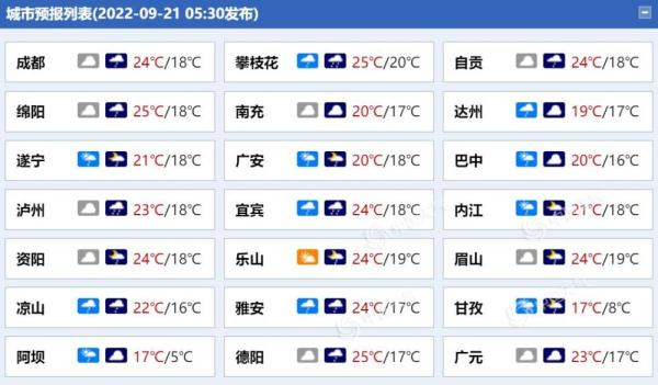 后天,四川盆地各市阴天有阵雨或雷雨,其中广元、绵阳、德阳、成都、巴中、达州、南充、广安、遂宁、资阳、内江11市的部分地方有中雨,局部大雨,个别暴雨;川西高原和攀西地区阴天有小到中雨,局部大雨。