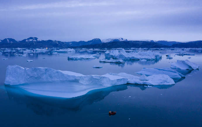 当地时间2019年8月15日,一艘船在丹麦格陵兰岛东部库鲁苏克镇的冰山附近航行。
