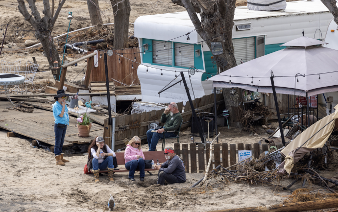 当地时间2023年3月12日,美国肯威尔,由“大气河流”引发的洪水,人们坐在被毁房屋附前,等待救援。