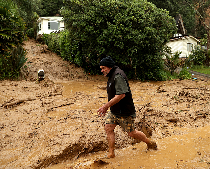 当地时间2023年2月14日,新西兰奥克兰,飓风加布里埃尔之后,一名居民在滑坡中涉水而过。新西兰宣布全国进入紧急状态,洪水和山体滑坡摧毁了几个社区。