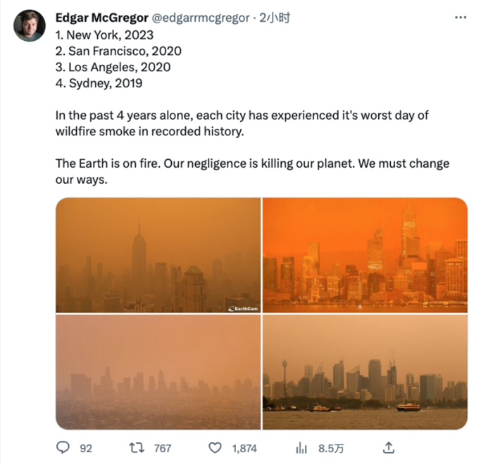 6月7日,纽约市深陷加拿大山火导致的烟霾之时,有网友在社交媒体上列出2019年悉尼、2020年洛杉矶和旧金山、2023年纽约的类似污染画面,并留言道:“地球在着火”“我们必须作出改变”。