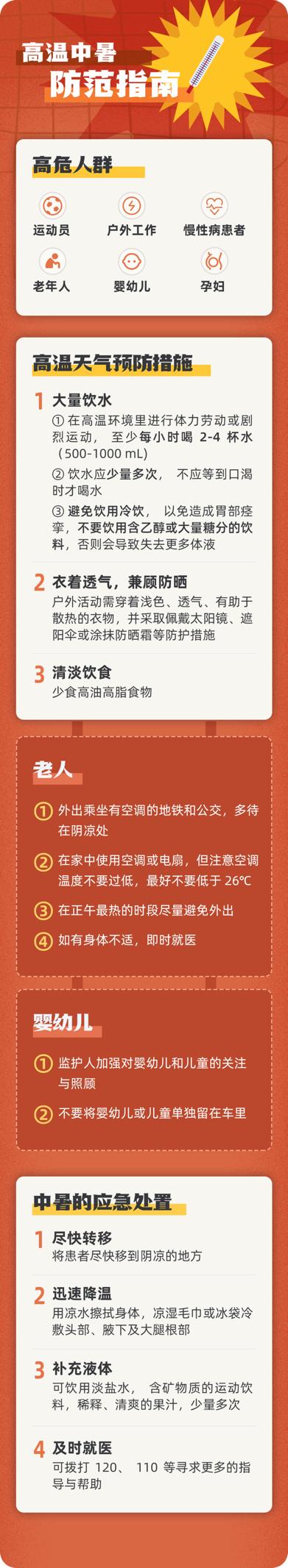 公共气象服务中心提醒公众需要采取积极有效的防暑降温措施,避免在日光下暴晒,避免高温时段或高温环境中的户外活动。