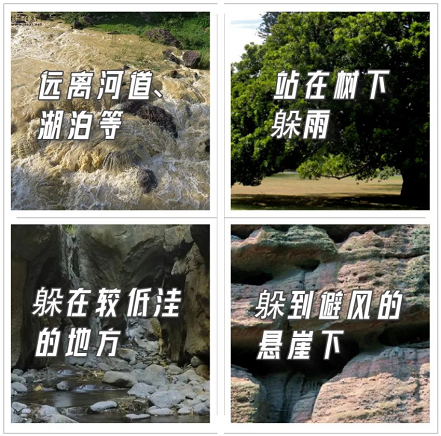 答案:暴雨时河水普遍会猛然上涨,请远离河道、湖泊等,向地势较高的地方转移;应避免走进发生山体滑坡、泥石流等灾害的山区路段;野外躲避暴雨时,切记不要站在树下,不要接打手机;格外注意电线杆倒塌、电线断折等。