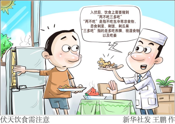“‘两不吃’是指不吃生冷寒凉食物,忌食剩菜、剩饭、剩瓜果。”历飞表示,天气炎热,很多人爱吃生冷寒凉食物如冰淇淋、冰西瓜、冰饮品等,以在短时间内缓解炎热的感觉,但这些食物摄入过多容易生湿伤脾。