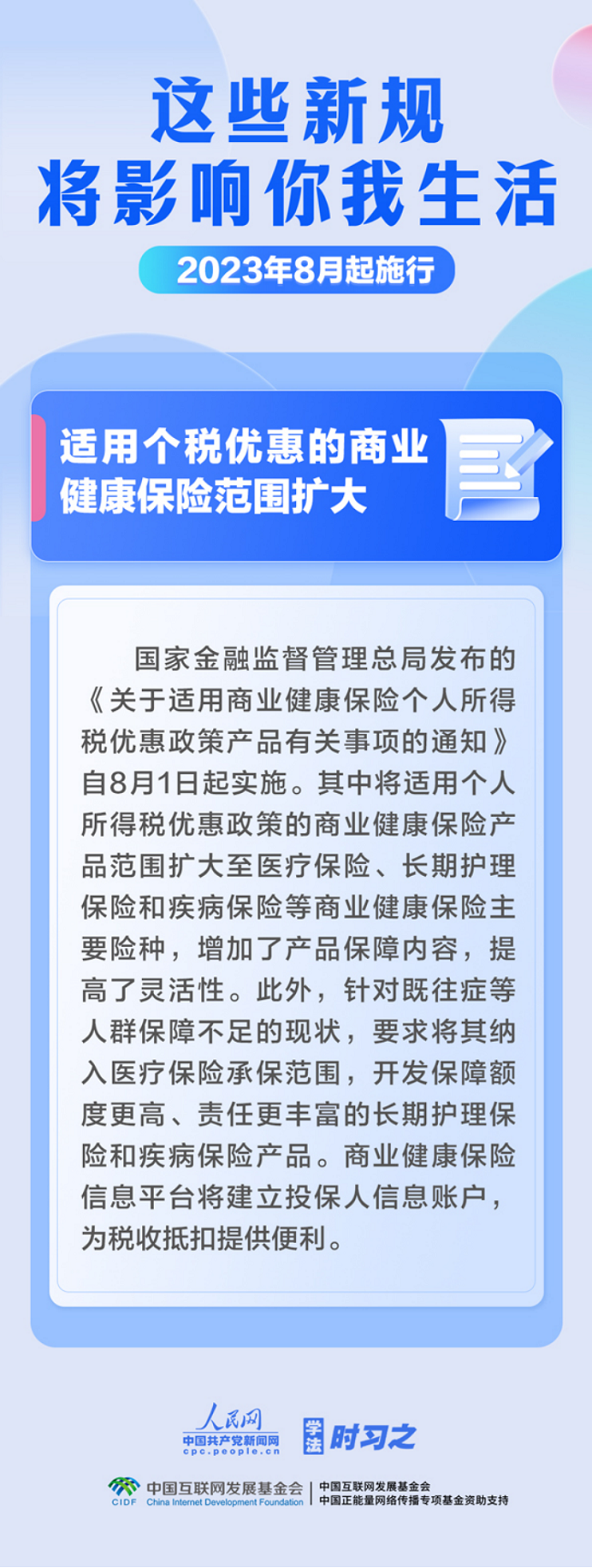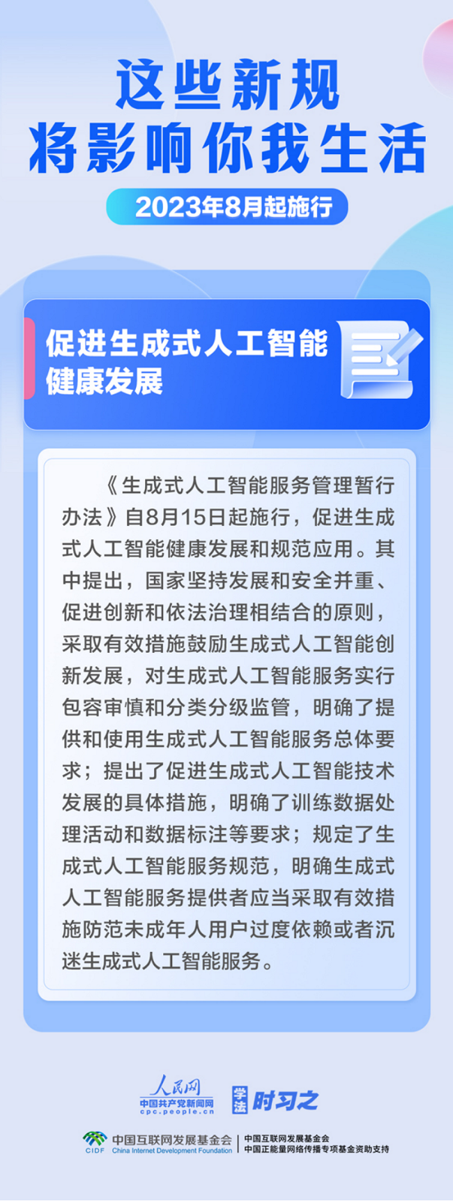 促进生成式人工智能健康发展;扩大适用个税优惠政策的商业健康保险产品范围;明确经营性人力资源服务机构不得向个人收取押金……8月,这些新规施行,将影响你我生活。