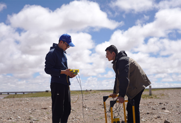 科考队员董士琦(左)和范越在长江北源楚玛尔河附近进行地质雷达探测(7月29日摄)。新华社记者 陈杰 摄
