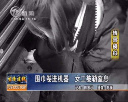 2017年12月,江苏常州一纺织厂内,一女员工因为天气冷,戴着围巾干活,没想到围巾被绞进机器,幸亏同事及时发现,才得以逃离鬼门关。