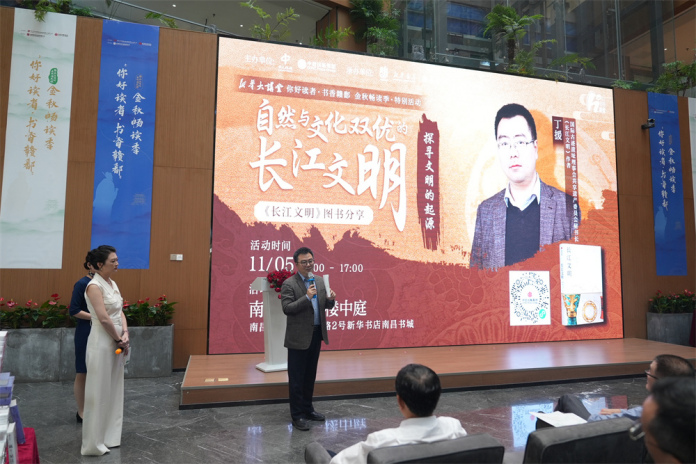 为启动仪式结束后,新华大讲堂开讲,国际古迹遗址理事会共享遗产委员会秘书长、《长江文明》作者丁援为读者、观众带来主题为“自然与文化双优的长江文明”的讲座。