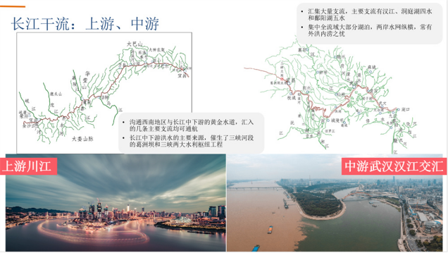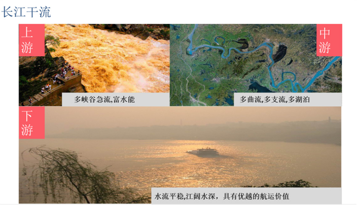 下面,再通过这几张图片跟大家介绍一下长江的情况。上游的金沙江,与怒江、澜沧江形成“三江并流”奇观,其云南部分已列入世界自然遗产名录。还有著名的虎跳峡等,这都是上游的一些地质奇景。这里支流众多,流域面积在1万平方千米以上的支流就有9条,并且水量丰沛,水能资源丰富,理论蕴藏量占长江总量的45.25%。