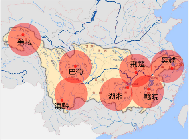 《长江文明》中,除三大经济带外,还讲到了长江流域的文化分区。总体来说,长江流域按上、中、下游划分,依次为巴蜀—荆楚—吴越三个大的文化区。上游是巴蜀文化,中游是荆楚文化,下游是吴越文化。然后小分区就是羌藏、巴蜀、