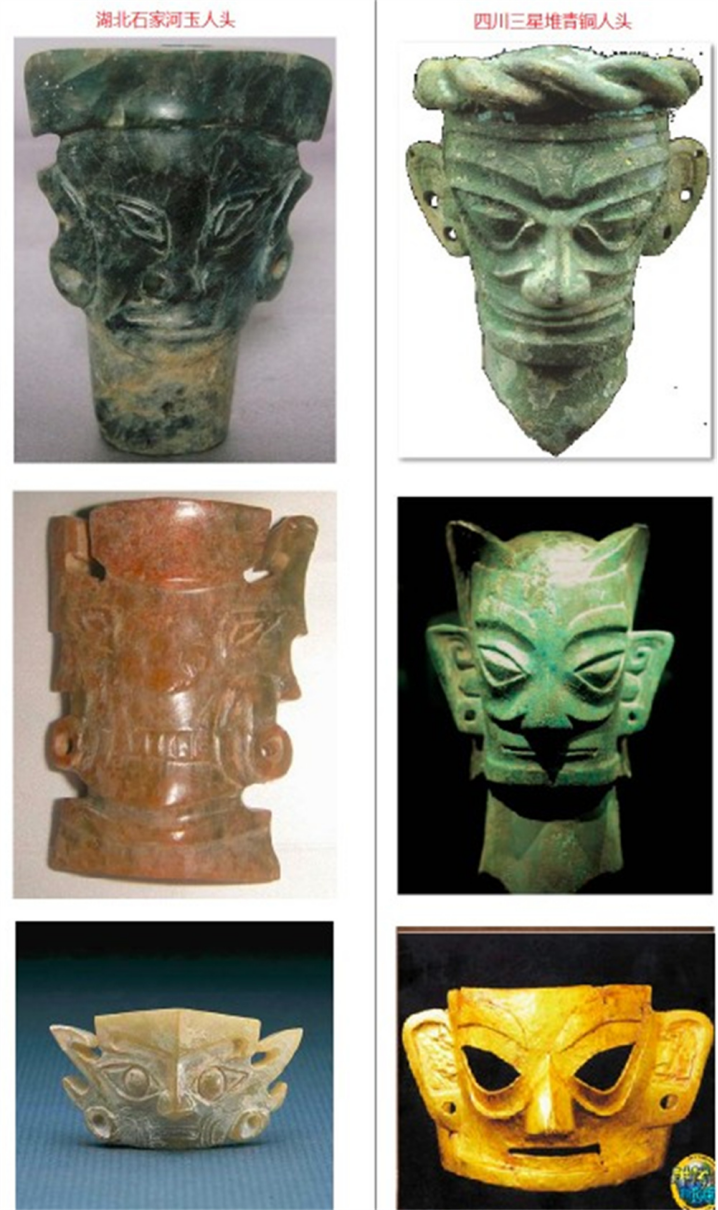 上图右侧三星堆出土的面具,左侧是长江中游地区的湖北石家河面具。去年《江汉考古》上有篇相关文章,也是最新研究成果。