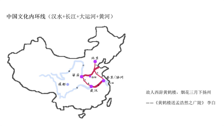 所以我想到一首诗《黄鹤楼送孟浩然之广陵》——故人西辞黄鹤楼,烟花三月下扬州。孟浩然是襄阳人,从汉水到黄鹤楼,从黄鹤楼往扬州走,然后再到洛阳去,洛阳就是隋唐北方政治中心。