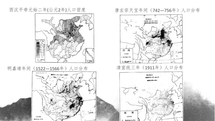 南北人口比重逆转:大家看这张图里面,它的颜色越深,人口密度越大。唐玄宗天宝年间,北方人口还是很多的,但是到了明清,就变成江南地区人口密度更大,特别是长江中下游地区人口占明显优势。到现在,大部分人口都在南方,长江流域是养活人口最多的一个地方。