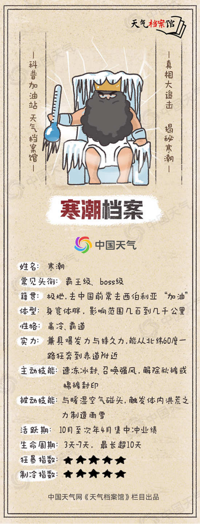 我叫寒潮,人称制冷界扛把子,因为身体里充满了寒冷空气,出现时总会不自觉造成“冷场”。论体型,我绝对算得上庞然大物,影响范围可达几百到几千公里,就连海上霸主台风在我面前有时候也只算个小弟。中国网友老爱用霸王级、boss级这些头衔来给我冠名,没错,天气界的高冷霸总就是我!