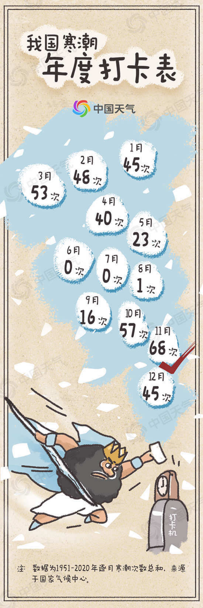 我的高冷属性可以说是天生的,极寒之地——南北极就是我的老家。不过我最爱往低纬度暖和的地方跑,最厉害的时候曾一路狂奔到赤道。中国是我最常去的地方之一,一般来说3到7天就可以从新疆跑到广东,日行千里。一年之中,我在11月表现最突出,1951到2020年我在中国一共出现了68次,相反在6到7月,我一次都没有露面。