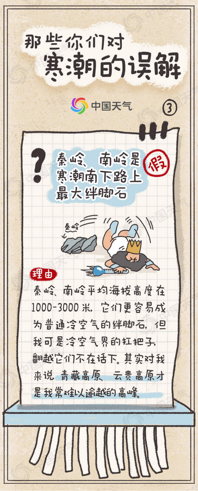 当媒体铺天盖地报道我时,有些南方小伙伴却感受不到我的存在,觉得我又被秦岭和南岭挡在千里之外了。难道秦岭和南岭真是我大举南下最大的障碍吗?的确,在一马平川的平原地带,我释放起冷气来更顺手,而当碰到山峦起伏的崇山峻岭,就想掉头跑路。但对我来说,南岭、秦岭海拔不算太高,一般来说只能削弱我部分实力,平均海拔比它们更高的青藏高原、云贵高原才是我常难以逾越的高峰。