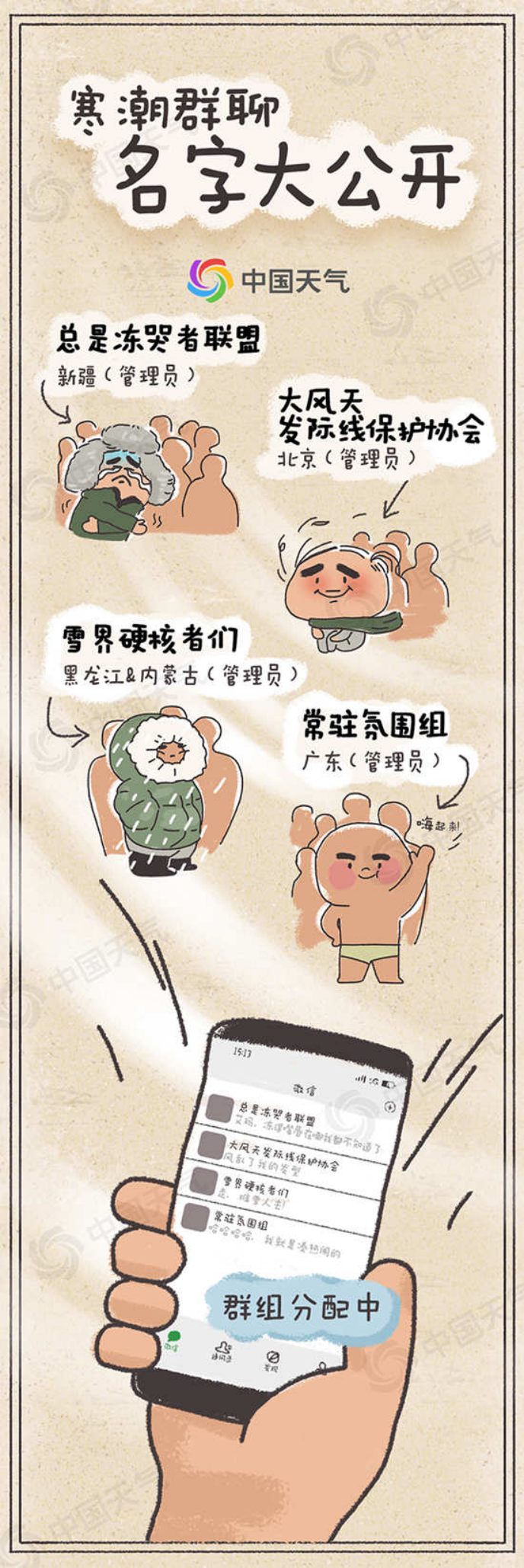 其实我的实力有高低之分,经常受到大气环流等因素影响发挥不稳定。气象专家一般根据高压中心值、降温以及雨雪制造能力判断我实力的强弱。不同于气象专家的专业判断,各地网友更注重体验感,他们还抱团加入了不同寒潮群聊,比如“总是冻哭者联盟”、“大风天发际线保护协会”、“雪界硬核者们”、“常驻氛围组”。“常驻氛围组”平时最热闹,他们最大的愿望就是看雪,所以讨论最多的话题就是怎样才能让我带雪过来。