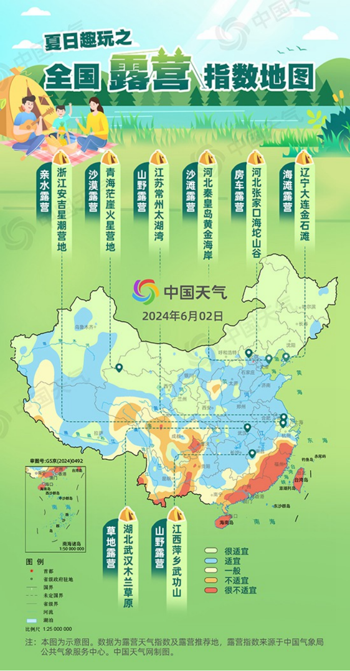 伴随夏季的到来,选择露营消暑的人越来越多,无论是探访森林秘境、畅游海边沙滩,还是驰骋沙漠天地,众多露营玩法丰富了人们的休闲生活。天气温暖风不燥,正是露营的好时节。中国天气网联合中国气象局公共气象服务中心发布全国露营指数地图,十大推荐地玩法多多,还有户外安全攻略,助你乐享自然野趣。