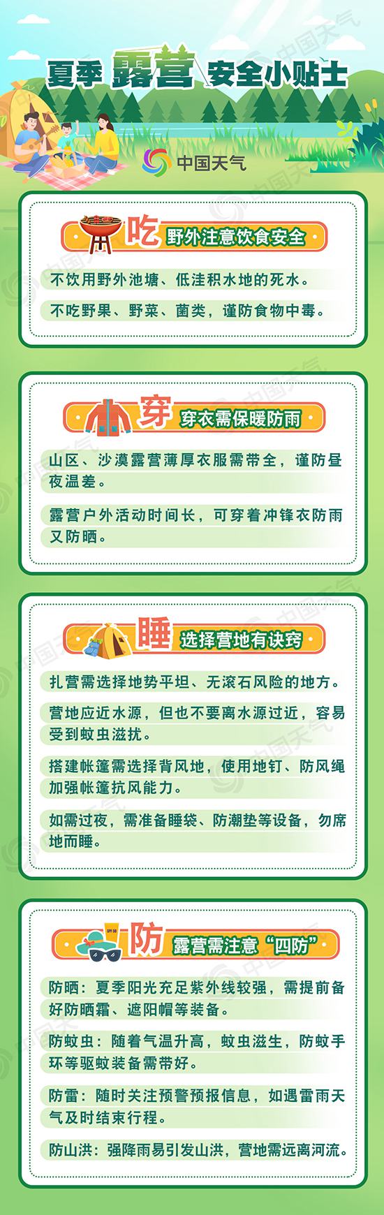 露营的活动丰富,乐趣众多,但也暗藏不少危险。户外露营怎么玩才安全?中国天气网从吃、穿、睡、防等方面,总结了详细的安全露营攻略,一起了解一下。