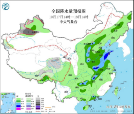 全国降水量预报图10月17日14时-18日14时(图片来源:中央气象台)
