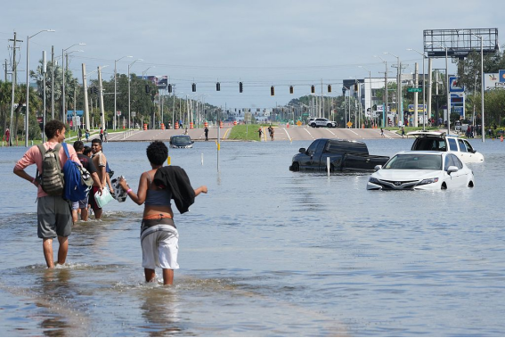 当地时间2024年10月10日,佛罗里达州,孩子们走在被洪水淹没的街道上。