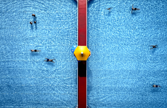 当地时间2024年9月3日,德国法兰克福,人们在公共游泳池游泳消暑。