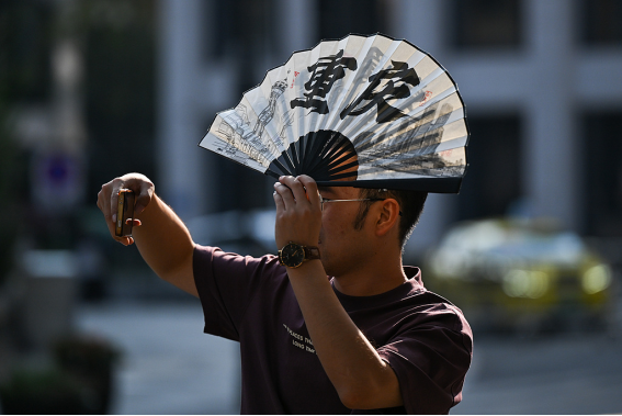 2024年9月18日,重庆十八梯传统风貌区,游客手持扇子遮阳。