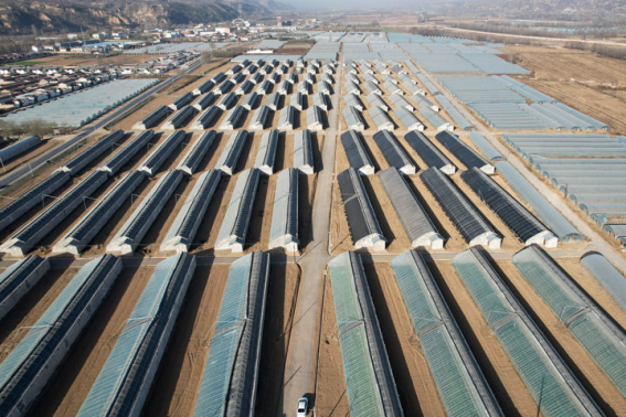 2023年11月26日,甘肃省平凉市泾川县泾汭河川区万亩设施蔬菜产业园王村核心区(无人机照片)。这是当地依托天津市东西部协作帮扶资金实施的联建项目。新华社记者 范培珅 摄