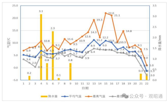 图 9:塘房站 2024 年 1 月 1 日至 22 日逐日平均平均气温和降水量时序
