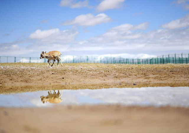 图为藏羚羊在可可西里国家级自然保护区索南达杰保护站野生动物救助中心活动(2023年5月30日摄)。新华社记者薛玉斌摄