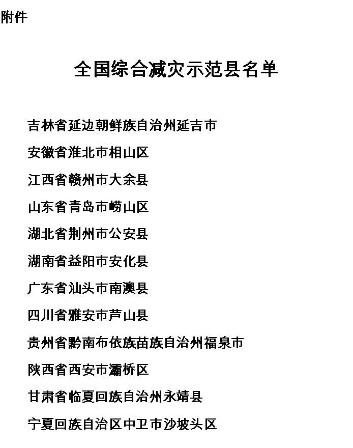 2019年以来,全国综合减灾示范县创建试点单位认真贯彻落实党中央、国务院关于防灾减灾救灾的决策部署,加强组织领导,强化资源统筹和力量整合,创新推动综合减灾工作深入开展,取得积极成效。为充分发挥典型示范和引领作用,根据全国综合减灾示范县创建工作有关规定,经评估验收、复核认定,国家防灾减灾救灾委员会办公室、应急管理部决定授予吉林省延边朝鲜族自治州延吉市等12个县(市、区)全国综合减灾示范县称号(名单见附件),有效期为5年。